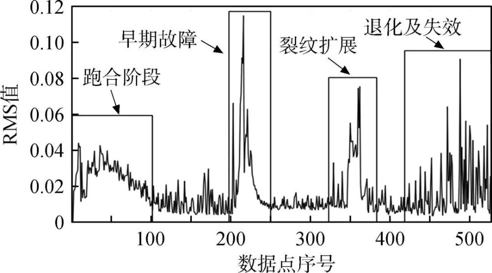 圖2 軸承全壽命實驗聲發(fā)射信號RMS值變化[43]