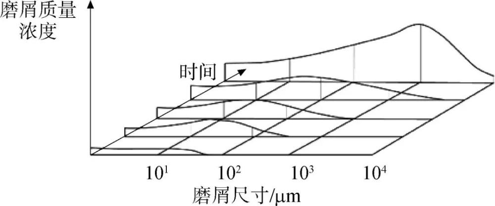 主軸軸承通常都有大流量潤滑油循環(huán)使用,當出現(xiàn)磨損、疲勞等會產(chǎn)生顆粒進入潤滑油。潤滑系統(tǒng)中的磨屑質(zhì)量濃度和顆粒尺寸會隨時間變化,如圖4所示,根據(jù)潤滑系統(tǒng)中的磨屑尺寸、質(zhì)量濃度、形貌、成分可以判斷設(shè)備是否故障及故障位置。